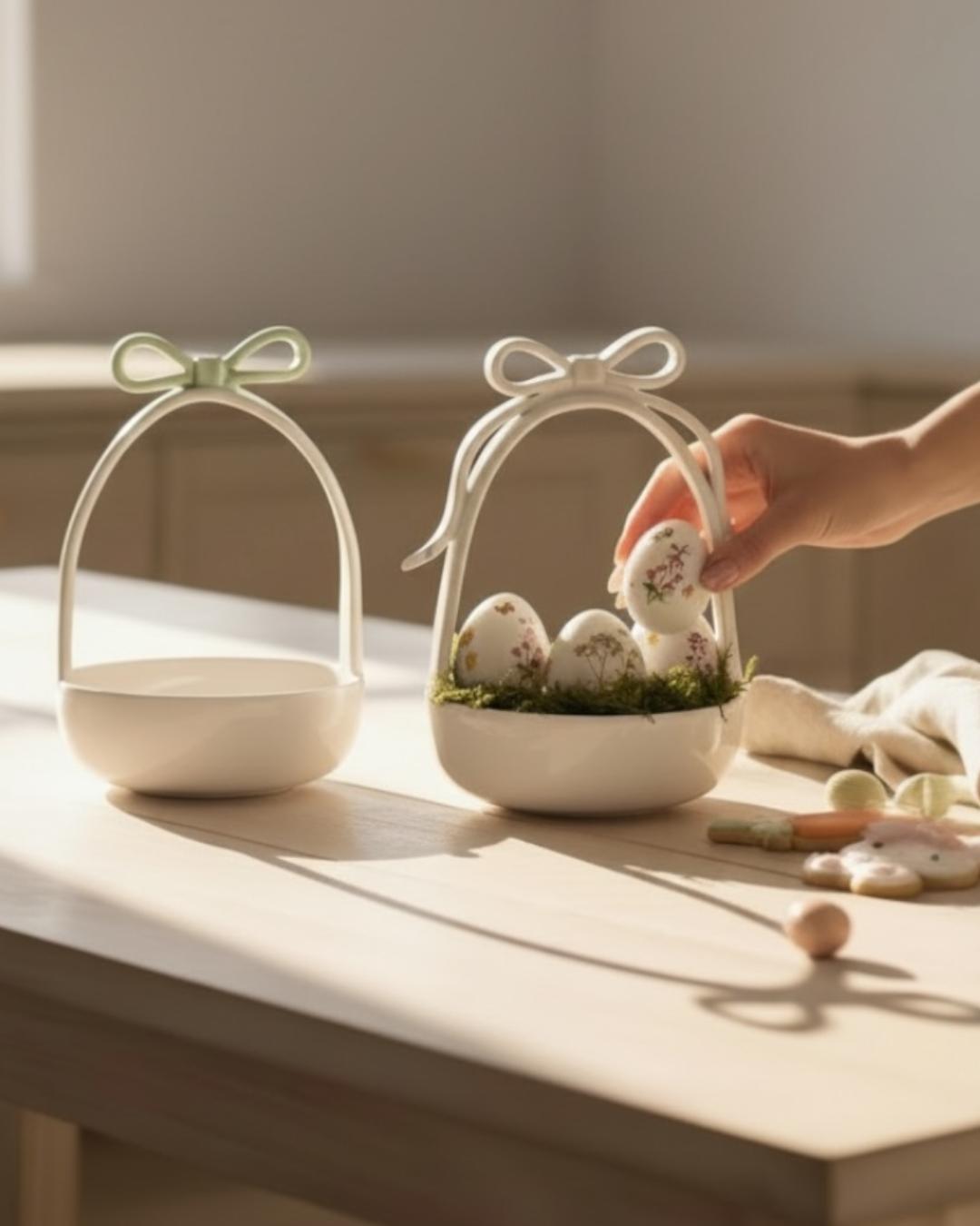 Una pieza delicada y encantadora, perfecta para celebrar una Pascua especial. Nuestra canastita de cerámica está hecha a mano y diseñada para acompañar tus momentos más lindos: ideal para presentar huevos de chocolate, galletas, flores o decorar con tus huevos de cerámica favoritos.