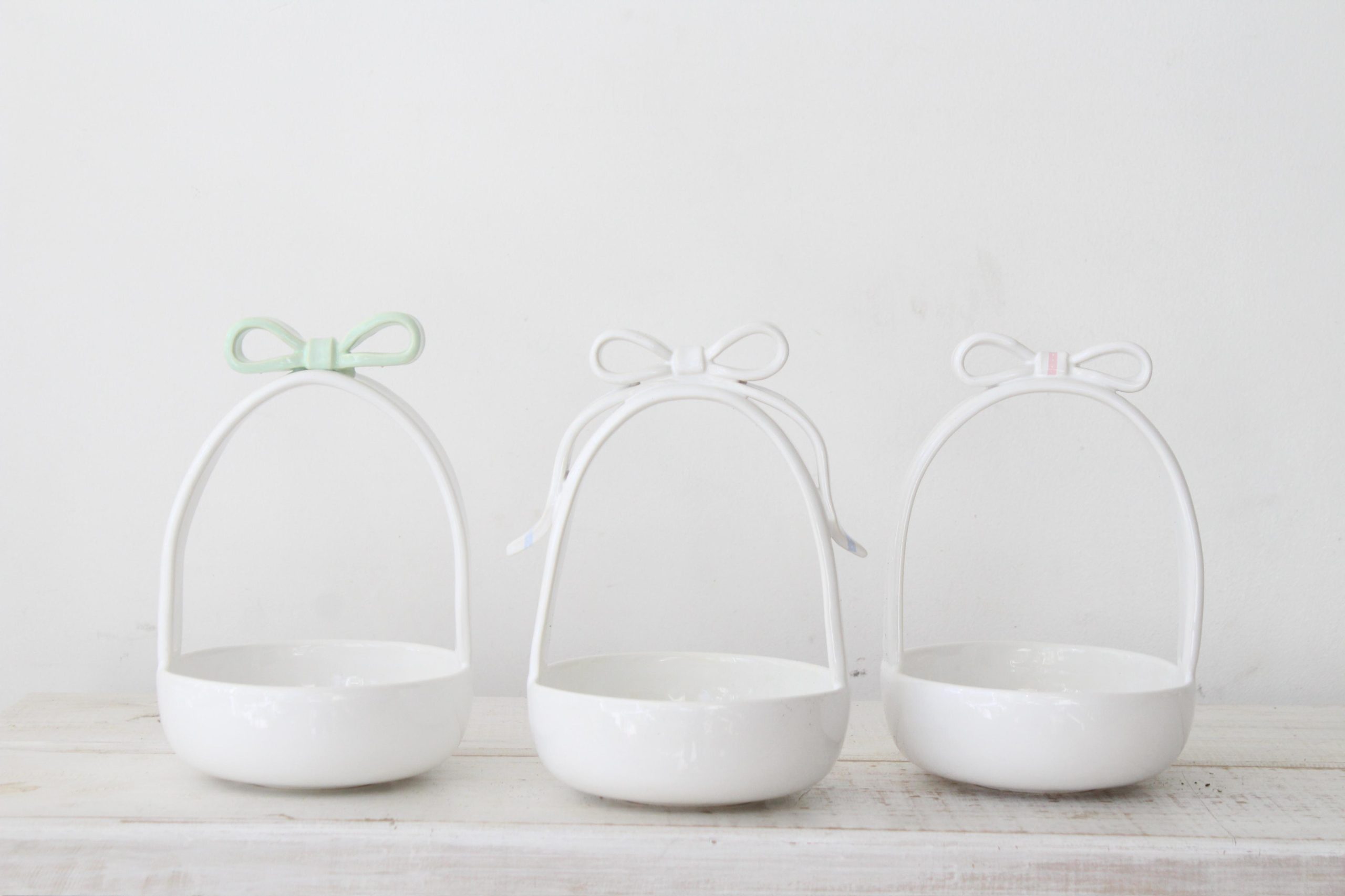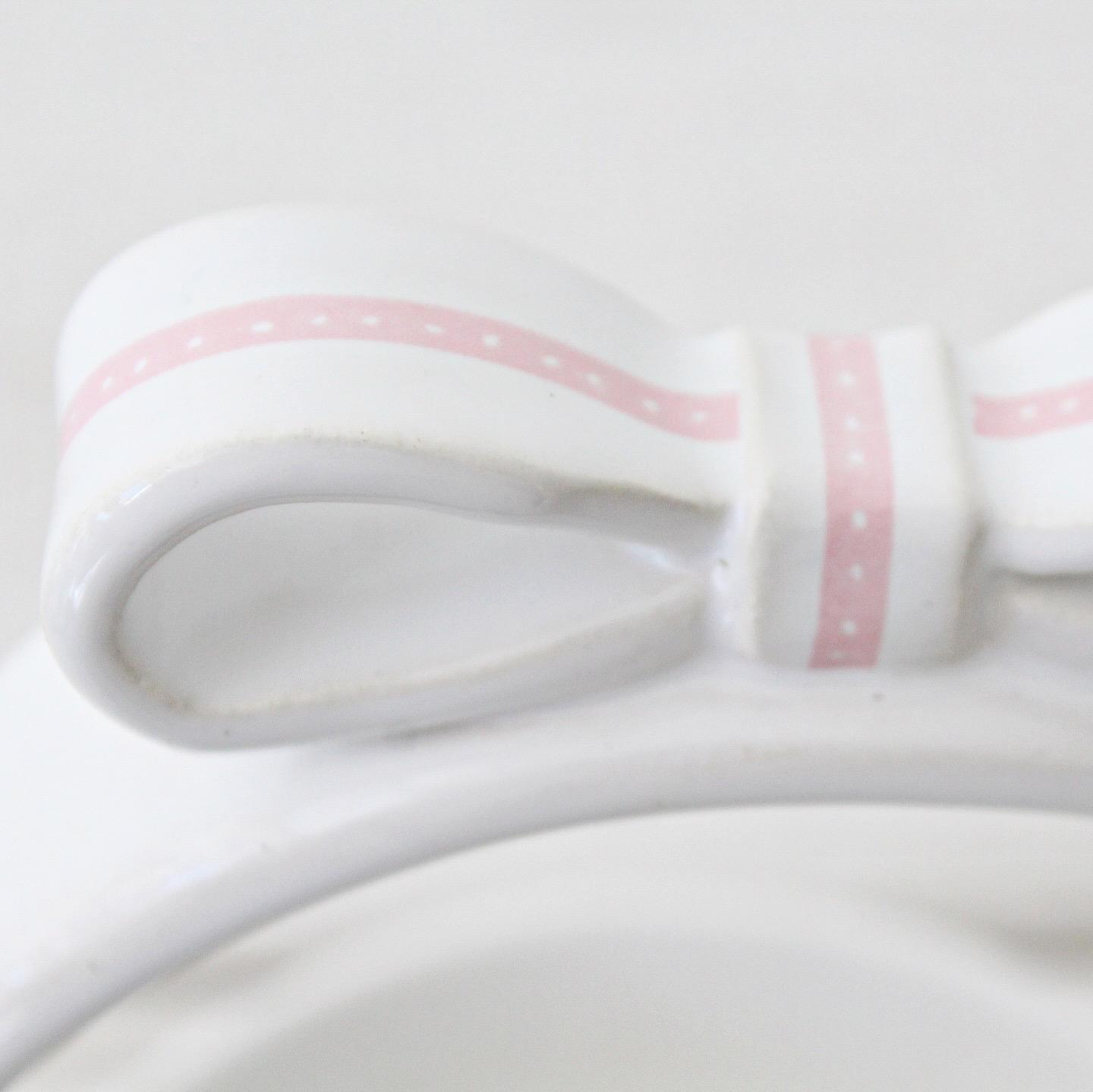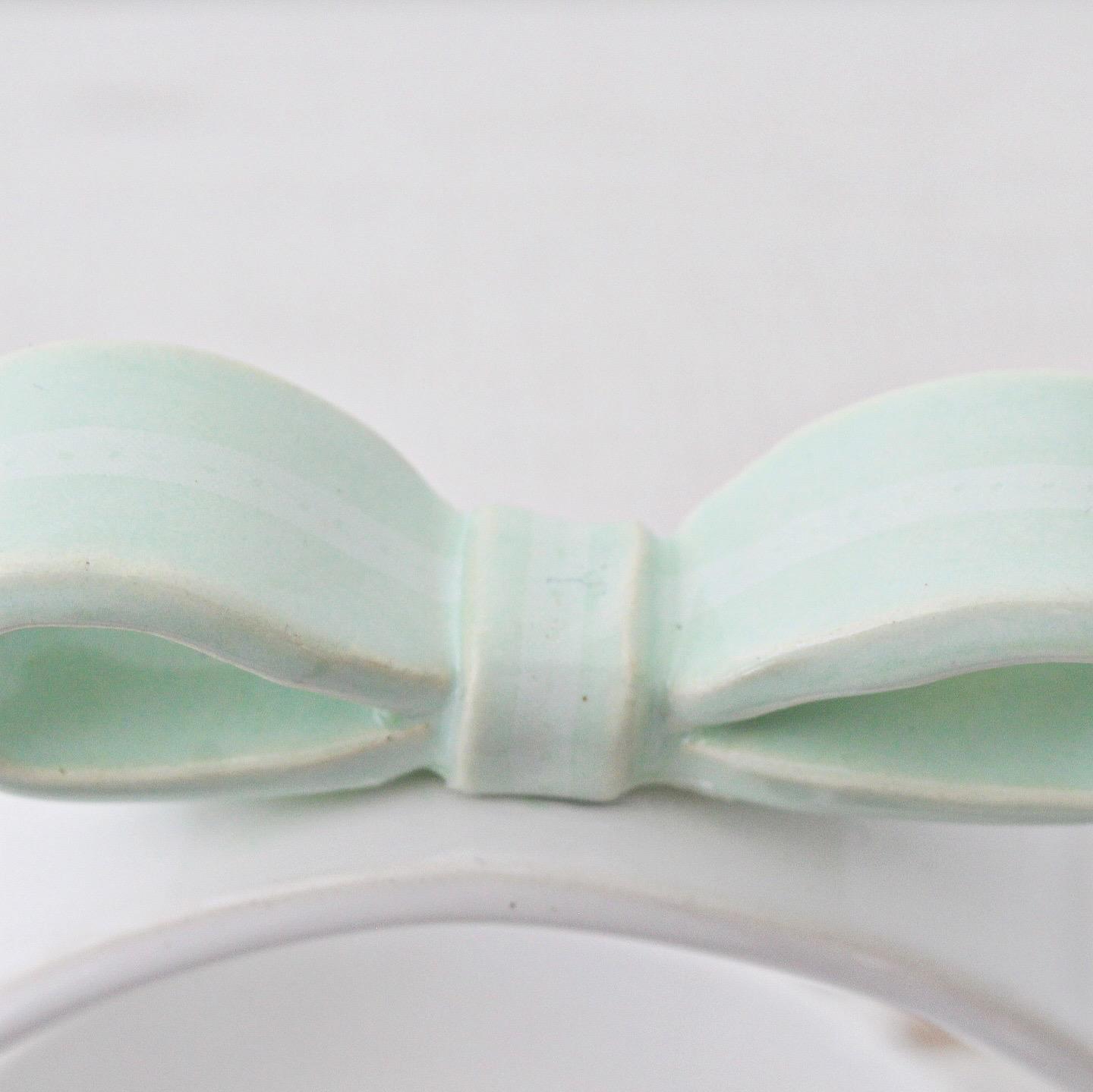 Su acabado en blanco resalta la pureza y elegancia de la pieza, mientras que el lazo en tonos rosado, verde o celeste aporta un toque suave y primaveral que combina con cualquier mesa.