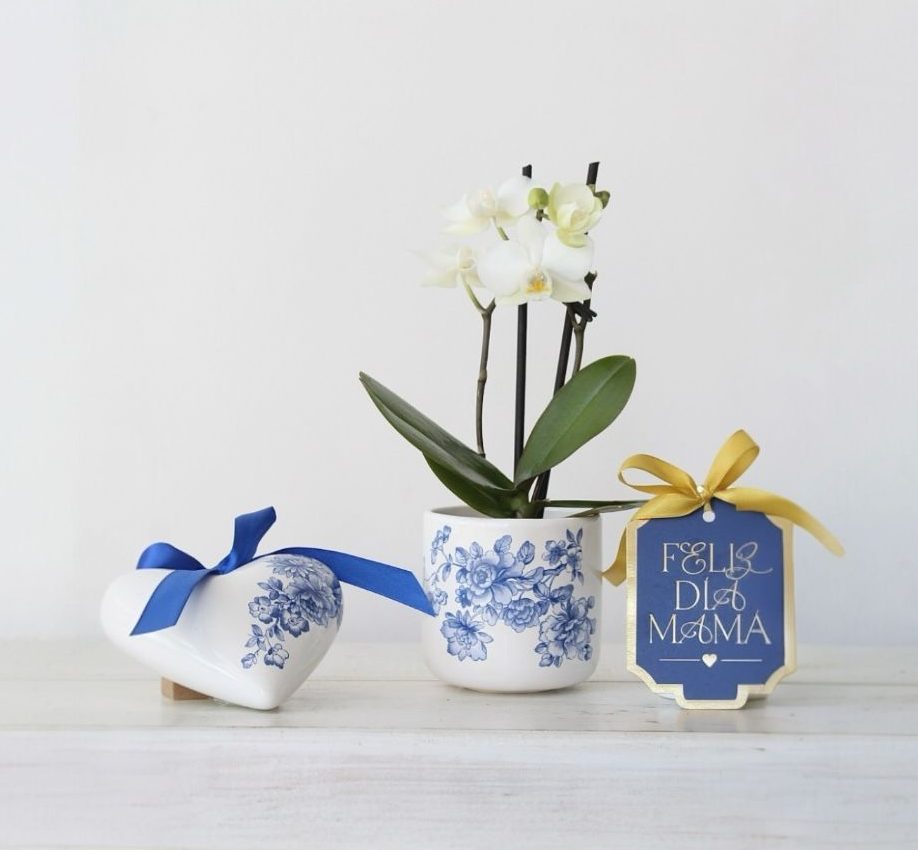Este dúo incluye una maceta de cerámica blanca, decorada a mano con flores en tonos azules, de diseño fino y atemporal. En su interior, una mini orquídea natural de flores blancas, que aporta vida, suavidad y una presencia serena al espacio.