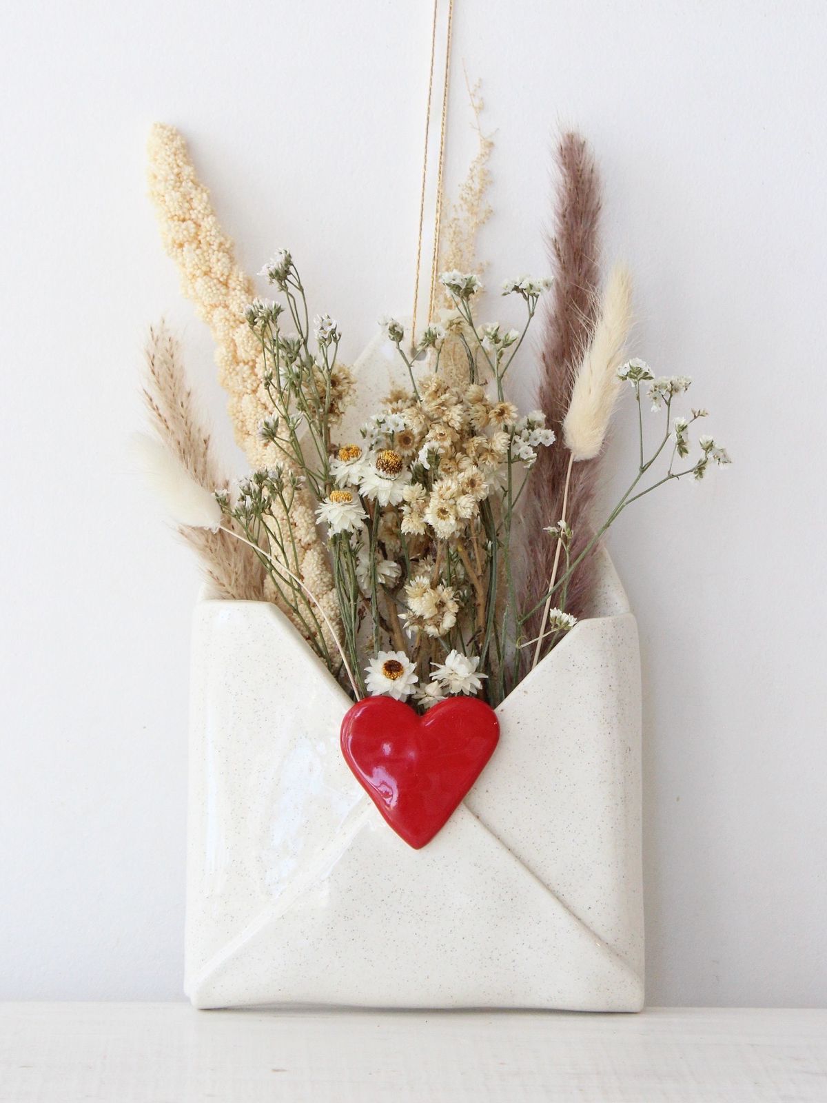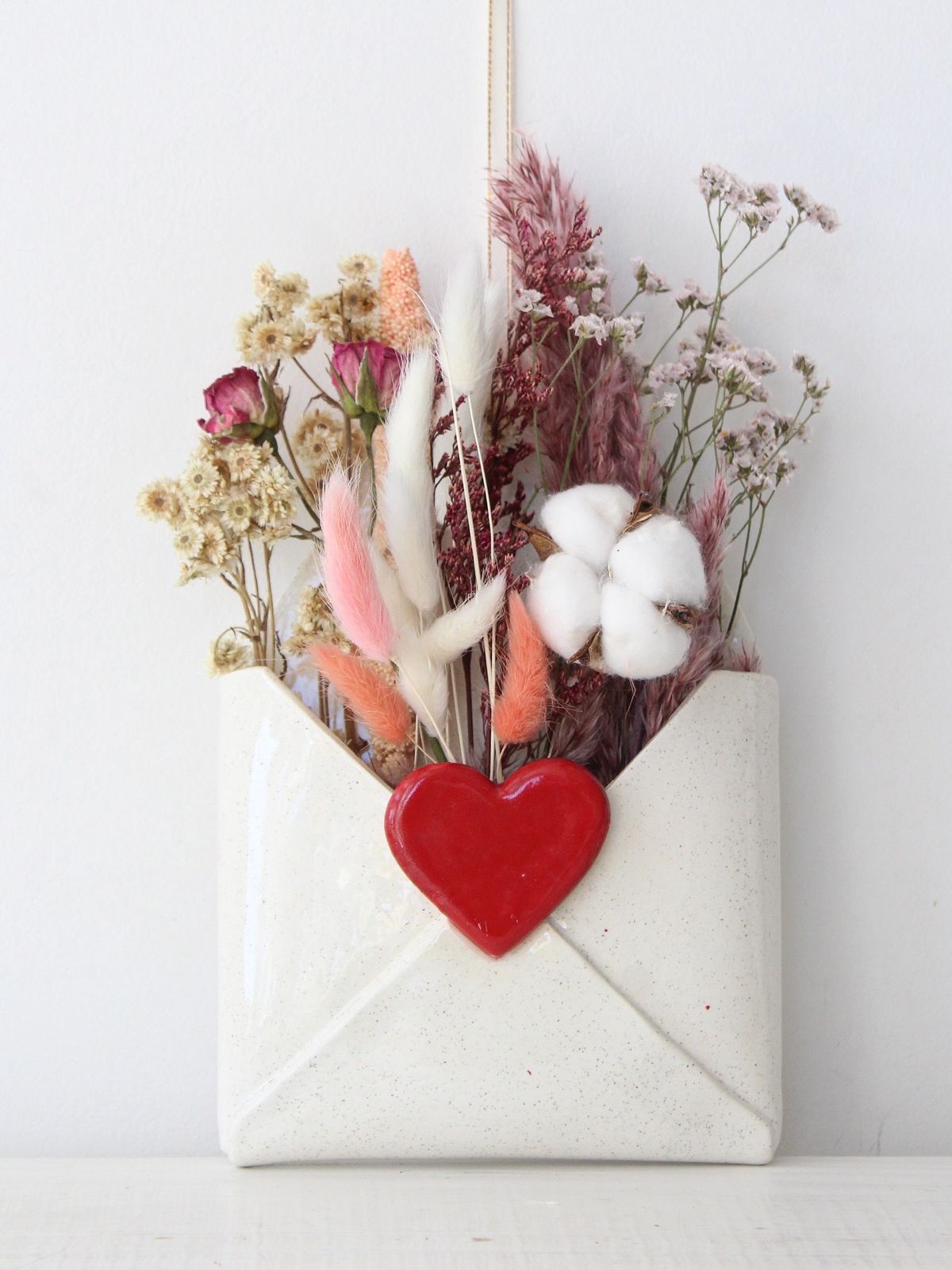 Este delicado sobre de cerámica está diseñado para colgar o apoyar sobre una mesa, y en su interior puedes colocar plantas, flores, mensajes o lo que tu imaginación quiera expresar.